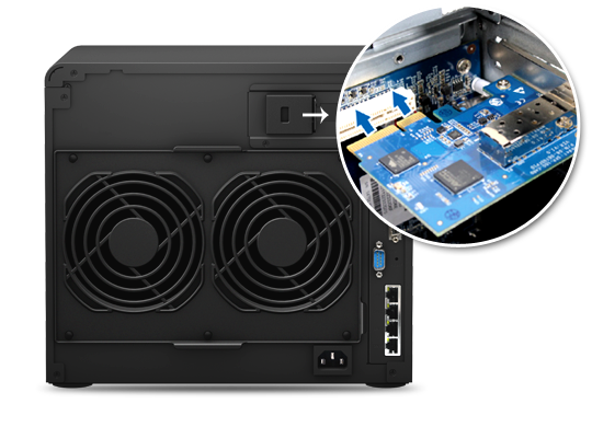 除了內(nèi)建的四個 Gigabit 網(wǎng)絡(luò)埠之外,DS3615xs 內(nèi)建一個 PCI Express 3.0 x8 插槽來安裝 10GbE 的網(wǎng)絡(luò)適配器 (NIC),藉以提升網(wǎng)絡(luò)聯(lián)機(jī)帶寬,為你存儲系統(tǒng)上需要處理大量數(shù)據(jù)的應(yīng)用程序提供優(yōu)越效能。此外,DS3615xs 內(nèi)建每秒 6Gb SATA III 介面支持,可將 SSD 的高速傳輸效能完整發(fā)揮,確保系統(tǒng)處理多項(xiàng)任務(wù)時,仍維持良好的傳輸效率。