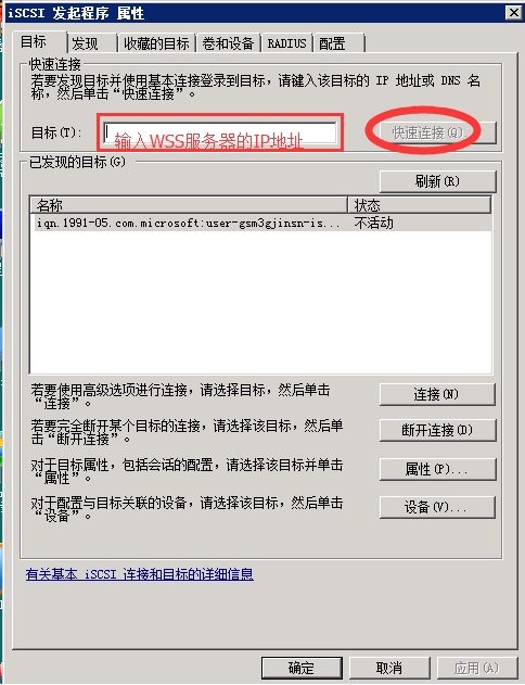 打開ISCSI 配置界面,在目標中輸入WSS服務(wù)器的IP地址,然后點擊"快速連接",當連接成功后完成后續(xù)配置。